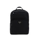 Re-Nylon backpack by Prada, handle on leather top, adjustable shoulder straps, padded mesh back, zippered top closure, interior slit pocket with zipper closure, interior patch pocket, two exterior zippered pockets, contrasting iconic monogram band patch on front.