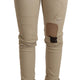Beige Denim Cotton Bottom Slim Fit Folded Pant