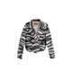 Retrofête Black/White Denim Short Jacket. Double-breasted front fastening with snap buttons, two side pockets, deep neckline, elastic waist, cropped, wide sleeve with elastic cuffs.