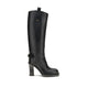 Burberry’s Cavalier High Boots, inspired by the brand’s equestrian tradition, are crafted in Italy from smooth calfskin. With a column silhouette that reaches to the knee, they feature side tabs, buckled ankle straps and a discreet heel. The sole is embellished with the Equestrian Knight Design contoured in the iconic Knight Blue. The round toe and Burberry lettering engraved on the buckle complete the design.