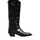 boots feature a sleek black finish. Designed with an over-the-calf silhouette, they offer a striking style statement while providing a comfortable fit. Perfect for pairing with skirts, dresses, or slim trousers for an effortlessly chic ensemble.