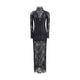 The long dress by Paco Rabanne combines elegance and sensuality through an intricate play of textures. Crafted from floral lace and ivory stretch viscose jersey, it embraces the silhouette with a fitted shape that enhances its natural lines. The high neck and long sleeves add a sophisticated touch, while scalloped hems and a central back slit bring fluidity and femininity. An iconic piece that embodies the bold yet refined spirit of the Maison.