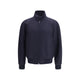 The cashmere Bomber Jacket by Fendi is an elegant and lightweight garment made from dark blue cashmere. Featuring a high collar, long raglan sleeves, and elasticated cuffs and hem, it has diagonal pockets on the sides and a double-slider Fendi zip closure. The back of the collar is embellished with tone-on-tone embossed FF patches, while palladium-finish metal accessories complete the refined and contemporary design.