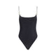 The Glazed Lumière One Piece Swimsuit by Oséree combines elegance and modernity with its shiny lamé fabric and sophisticated silhouette. Featuring a square neckline at the front and a deep neckline at the back, it tastefully enhances the silhouette. The straps are embellished with gold nuggets, a precious detail that reflects the brand’s refined aesthetic.