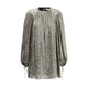 Chloé’s silk lamé mini Dress is a mix of elegance and luminosity, made of silk lamé that discreetly reflects light. It has a simple crew neck and puff sleeves, adjustable with ribbons for a playful touch. The back button closure adds a refined detail. Perfect for evening events, this dress combines classic design with a bright, sophisticated finish.
