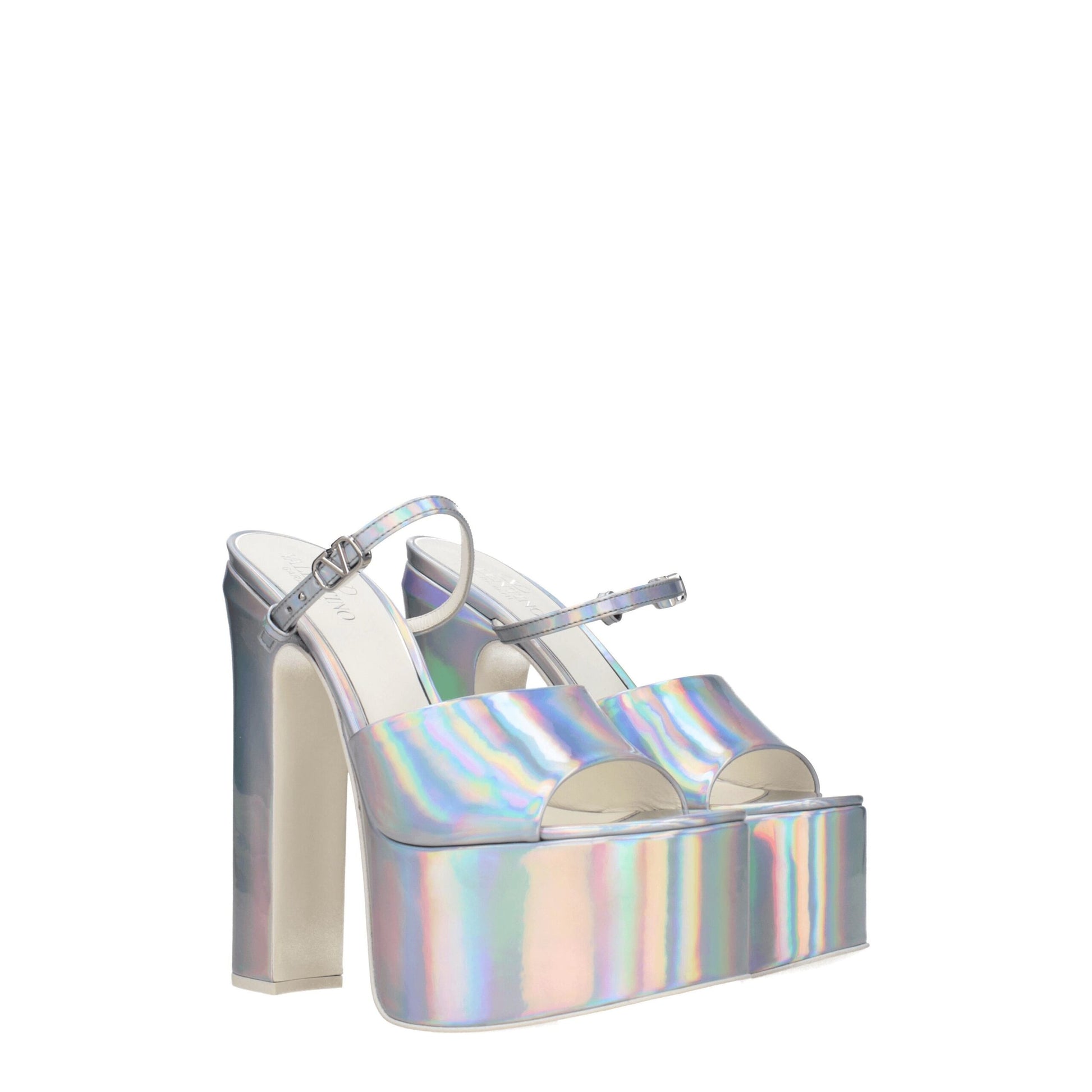 The product with MPN S0FS4AJJS13 and code F79332 patent leather in silver is a sandals designed by Valentino Garavani. It has features like side detail, metallic effect.