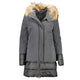 long-sleeved down jacket, hood with removable fur, 2 external pockets, contrasting details, zip and snap closure, logo