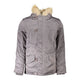 long sleeved jacket with hood, padded with real down, 2 pockets, 2 side pockets, 2 inside pockets, buttons and zip, logo