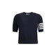Thom Browne’s knit T-Shirt is a garment with a clean and distinctive style. With a ribbed crew neck and hems, it features the brand’s iconic bands on the left sleeve, a detail that underscores its unique identity. The ribbed hem with slight side slits adds a touch of modernity and comfort, making it perfect for a casual yet sophisticated look. A versatile must-have for any wardrobe.