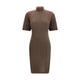 The Jaquemus knit dress features structured shoulders, a high neckline, and short sleeves. With a fitted design, it combines elegance with contemporary character, perfect for a bold and refined look