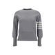 Thom Browne’s virgin wool Sweater is an iconic piece with a clean yet richly tailored design. A classic crew neck combines with a ribbed high hem, featuring practical side buttons that allow you to adjust the slits with discretion and functionality. The cuffs, also ribbed and button-fastened, add a touch of structured elegance. Distinguishing the sweater are the brand’s iconic horizontal bands, positioned on the left arm, which lend instant recognition and a graphic accent typical of the Thom Browne style.