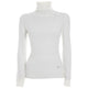 Yes Zee turtleneck sweater in soft stretch viscose blend yarn with lurex work, ribbed hems and cuffs, and logo tag at bottom