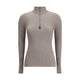 The High Neck Zip Top is an elegant and sophisticated piece, featuring a fabric that recalls lamé thanks to its shimmering highlights. The long sleeves and zipper give a functional and modern touch, while under the zipper is a refined shimmering monile detail in shades of silver and gray, which adds a discreet glow. Composed primarily of cashmere and silk, this top is the epitome of comfort and style, perfect for looks that want to combine elegance with a hint of sparkle.